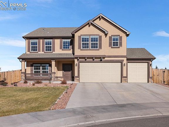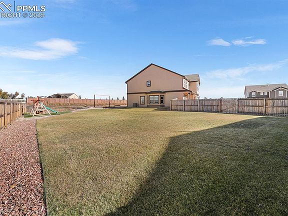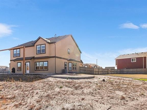 Welcome to a stunning 2023-built stucco masterpiece that blends modern luxury with timeless Colorado charm. This nearly 1-acre lot (yes, you read that right—expansive outdoor living space that's rare and remarkable!) offers unparalleled privacy and potential for your family's adventures, from weekend barbecues to starry-night gatherings. Step inside this 4-bedroom, 3.5-bath haven spanning over 3,000 square feet of open-concept elegance with lots of natural light provided by the many windows. Inside you'll find 4 bedrooms, an office, a large oversized pantry, a dining room, and a mudroom! Out the west side of the home, the mountains can be viewed in the distance over the neighboring rooftops. Retreat to the primary suite, your private oasis featuring a lavish 5-piece bathroom with dual vanities, a soaking tub, and a walk-in shower designed for ultimate relaxation. Three additional bedrooms provide ample space for growing families or home offices, all with walk-in closets of their own. Outside, the magic continues on your sprawling nearly 1-acre lot, complete with a large grass yard perfect for play, hosting, or pets. Gardening beds are included in the back as well as a firepit and playset! A large flower garden is present at the front east side of the home! The fully fenced backyard ensures secure, carefree enjoyment, while the attached 3-car garage offers room for vehicles, toys, and storage galore. With low-maintenance stucco exteriors and energy-efficient features, this home is as practical as it is picturesque. Priced to sell in this booming market—don't miss your chance to own it today! Please reach out to the listing agent with any questions!