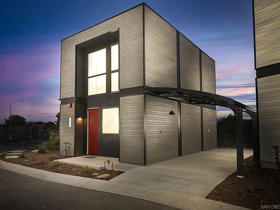 New Construction - this is one of the last units available in the development! The brand new Cantera neighborhood is located within walking distance of the Spring St trolley, Collier Park & the vibrant La Mesa Downtown Village. Enjoy stunning views, while also ensuring privacy from the hustle and bustle of city life. With a modern design, this beautiful home boasts two bedrooms and 1.5 baths, offering both comfort and convenience. The gourmet kitchen is a chef's delight, featuring top-of-the-line stainless steel Cafe appliances, sleek quartz countertops, custom cabinets (made in Germany, designed by DNA Design Group), luxury vinyl plank (LVP) flooring, soft-close drawers, and a waterfall style island, which is perfect for both cooking and entertaining. Custom tile and soaking tubs add a touch of luxury to the bathroom. The home's eco-friendly features include paid-for solar panels, allowing for energy-efficient living, and a mini-split AC/heat system that allows you to control each floor separately. Outside, each unit features a patio, a state-of-the-art glass carport (with UV protection), 2 driveway spaces & is wired for EV charging. Complex is FHA & VA approved. Photos are of a similar model unit with the same floor plan. Construction is complete, this unit is ready for moving in! The Cantera community epitomizes upscale, eco-friendly living in a uniquely designed neighborhood that blends modern luxury with natural beauty. Situated in a former rock quarry, each home within Cantera offers stunning views and privacy, yet is just a walk away from the Spring Street trolley, vibrant La Mesa Downtown Village, and Collier Park, where residents can enjoy a diverse mix of local shops, trendy cafes, and gourmet restaurants. Outdoors, private patios and native plant landscapes create personal retreats amidst natural rock formations. Cantera combines the serenity of its natural surroundings with the convenience of urban living, making it an ideal choice for those seeking a luxurious, energy-efficient home in a prime location.