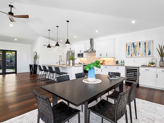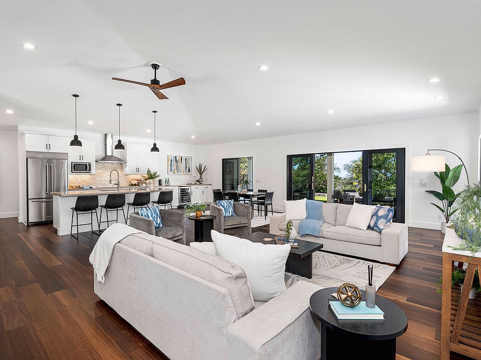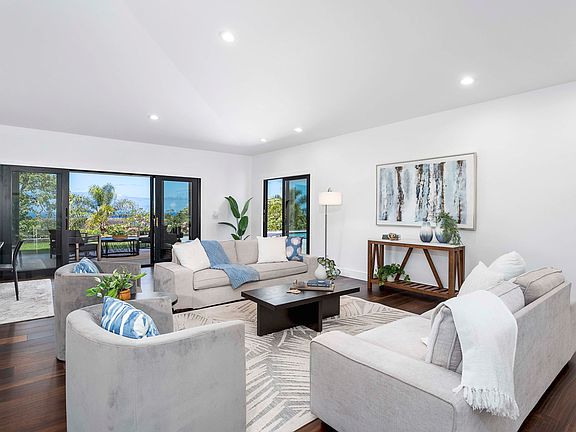 The one-level living design offers versatility and comfort for all. Stepping through the front door you'll be greeted by the grand open-concept great room where kitchen, living and dining spaces seamlessly blend under vaulted ceilings. This is the heart of the home, perfect for everyday living as well as entertaining. The great room anchors the home and transitions gracefully to the expansive covered lanai featuring calming mountain and ocean views, the perfect place to catch a stunning sunset.