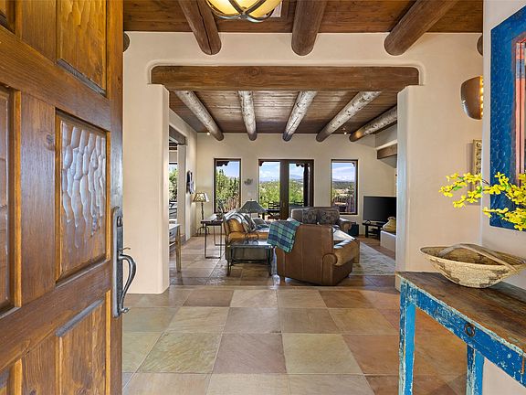 A welcoming enclosed courtyard and striking entryway lead inside, where sandstone floors contrast beautifully with vigas and wood-beamed ceilings. Smooth plaster walls add elegance, while thoughtful upgrades throughout the home reflect quality and care. The split three-bedroom floor plan is enhanced by a spacious bonus room with a closet, currently used as an office and game room. The updated kitchen features stainless steel appliances, a convection cooktop, and a cozy dining nook warmed by a kiva fireplace. The owner’s suite is a retreat of its own with mountain views, outdoor access, and a luxurious 400+/- square foot bath, boasting a claw-foot soaking tub, steam shower, dual vanities, and a private water closet with bidet. You will also love the spacious laundry room with plenty of storage and utility sink and access to the back yard. Practical amenities include a shared well on the property that supplies both domestic water and drip irrigation, with the option to connect to the community water system if desired. A brand-new TPO roof was installed in 2018. On the acreage, an alternate site with electric and water is ready for a barn, guest house, or studio—making this property as versatile as it is beautiful. Come experience the best of Northern New Mexico living—space, views, and a home filled with timeless Santa Fe character.