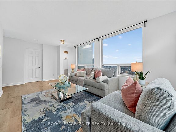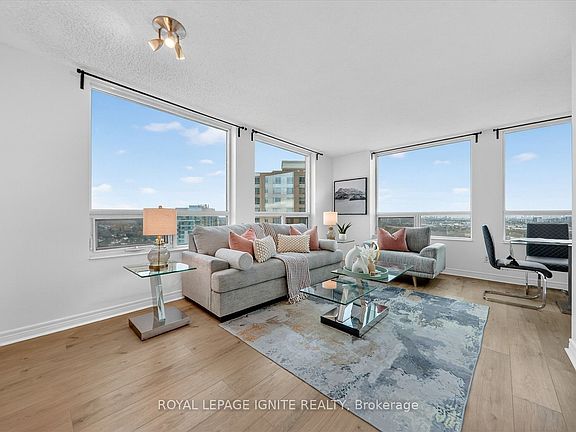 Rare Find: Tridel-built upscale corner unit at 360 at the City Centre! This exceptionally well-maintained, sun-filled corner suite offers panoramic city views, including the CN Tower, gorgeous sunsets, beautiful morning sunrise views, and a peaceful view of Lake Ontario. The freshly painted unit features a spacious primary bedroom with a walk-in closet and ensuite, granite kitchen countertops, newly installed modern laminate flooring, and a private balcony with sweeping southwest views. The split-bedroom layout provides added privacy, and the location is unbeatable-just steps from Scarborough Town Centre, restaurants, grocery stores, library, movie theatre, banks, shops, parks, and transit, with easy access to Highway 401,TTC, and GO Transit. Enjoy resort-style amenities such as an indoor pool, hot tub, sauna, large gym, billiards room, party room, BBQ area, meeting room, game room, 24-hourconcierge, and visitor parking. Two parking spaces, a locker, and included heating and water make this stunning Tridel community home the perfect blend of comfort, convenience, and lifestyle.