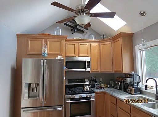 This lovely, modern Colonial has all the modern flare. Open concept through out lower level supported by steel beams. This updated and upgraded kitchen offers skylights, vaulted ceilings, granite counter tops and all stainless steel appliances. The basement offers a cedar closet for extra storage. This yard is adorable with the large platform deck along with a one car garage. This house was gutted from the studs out and updated in the last 7 years. All done with permits and inspections.