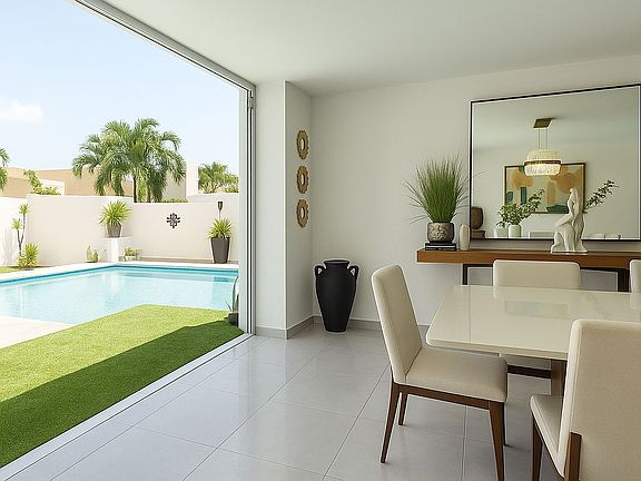 • Elegant dining area with folding glass doors overlooking the pool