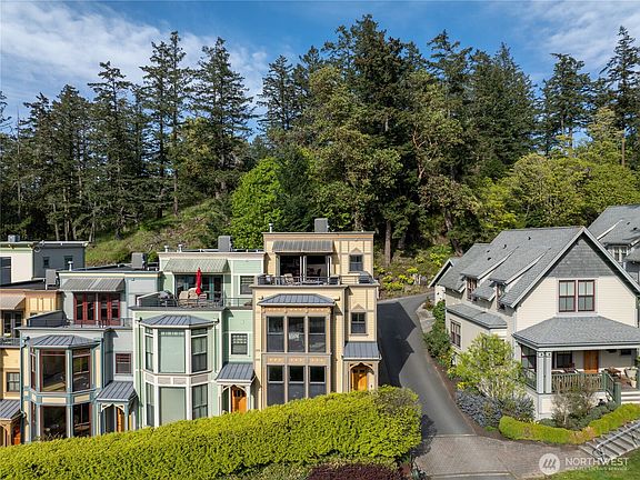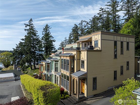 Water View Townhouse in the Heart of Roche Harbor Village. Savor stunning harbor sunsets from an impressive top-floor entertainment space complete with a wet bar and roof deck. This stately 3-bedroom, 4-bath, 2,377 sq ft townhome is steps from upscale restaurants, boutique shops, marina, groceries, pool, tennis courts, hiking trails, and full Roche Harbor Resort amenities. The chef’s kitchen boasts a Wolf range, Subzero refrigerator, and granite countertops. The lower-level main area features an open design anchored by a propane fireplace. Elevator access allows effortless transport to all floors. Includes a one-car garage and additional parking space. Proven historic rental income potential.