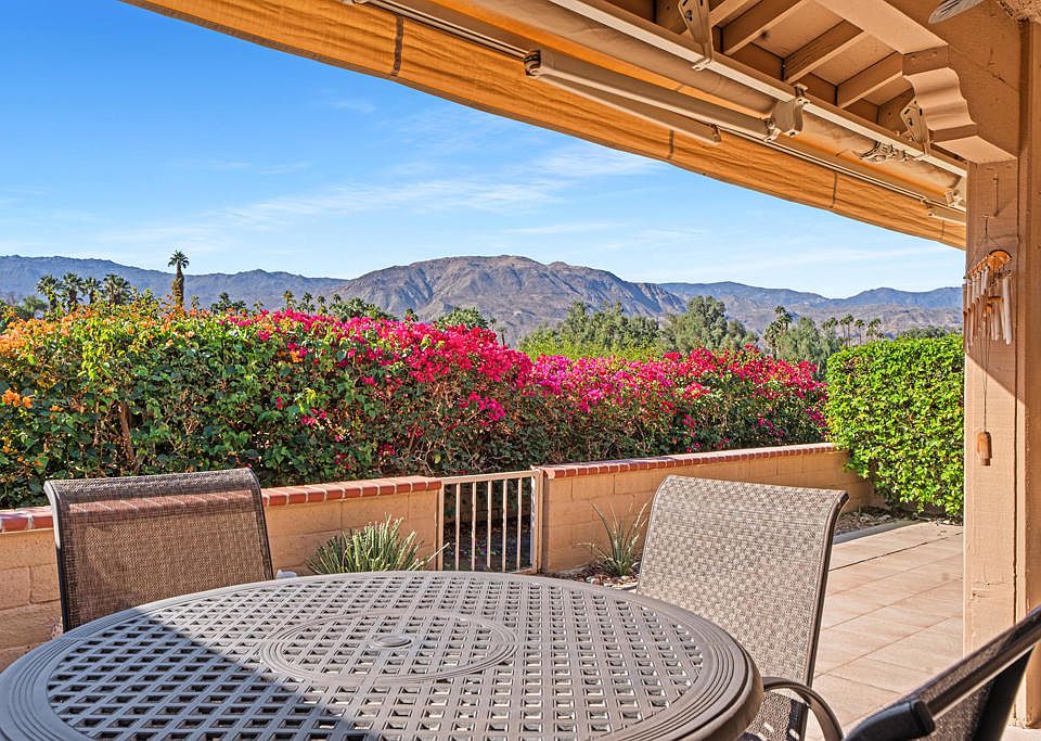Ideally situated in a serene location with spectacular southern mountain views close to one of the 21 community pool and spas. Remote controlled retractable awning ensures full use of the patio for entertaining or relaxation. This well maintained approximately 1,731 square foot condominium is turn key and move in ready! Third bedroom can be used as den/office with sofa sleeper and calming view of atrium. Peace of mind comes with a new water heater, and newer air conditioning unit. Chaparral CC community offers a wide range of amenities. Residents have access to a recently remodeled clubhouse, tennis courts, pickleball courts, bocce ball courts, with many clubs and social opportunities to choose from. No need for a gym membership, there is also a fully equipped fitness center and a recreation room for residents to enjoy. This active, socially engaged community is conveniently located near the popular El Paseo shopping and dining district.