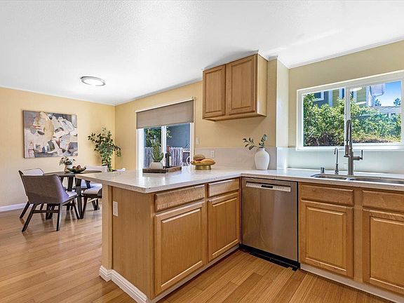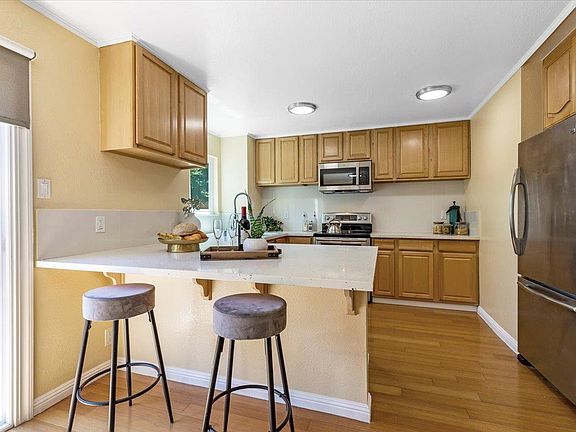 Welcome to this Charming end unit 2 story townhome in the heart of Mountain View, 2 bedrooms & 2 full bathrooms, Open floor plan, The updated kitchen boasts quartz countertops, & breakfast bar. The dining area opens to large private backyard, This home features with wood & tile flooring throughout, Dual pane windows, Wood burning fireplace in living room, Oversized bedroom with access to the brand new balcony, Updated bathroom with double sinks, extra cabinet storage & window, Detached 1 car garage plus 1 assigned parking, Inside laundry with washer & dryer provided, Newer water heater, Small complex with only 11 homes, Low HOA dues of $450/monthly, Across from Devonshire Park, Conveniently located with easy access to high tech firms and freeways