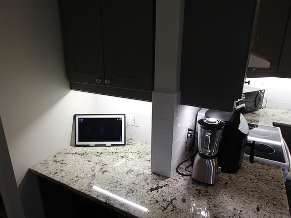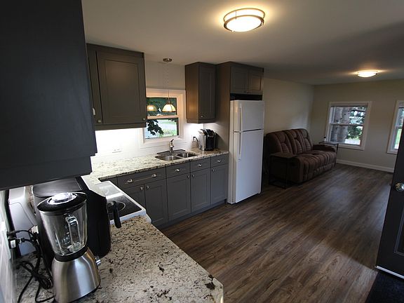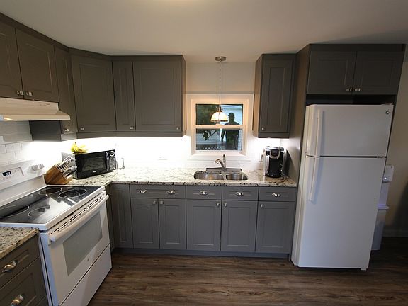 New kitchenGranite countertopSubway backsplashAmple cupboard spaceStove and fridgeNew bathroomLaundry area