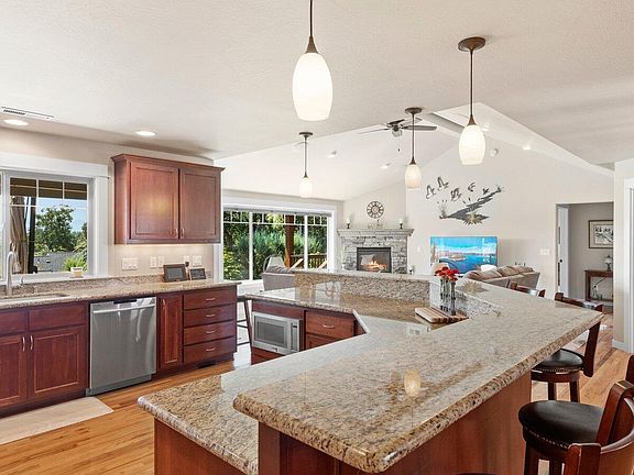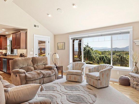 This one-of-a-kind custom home is a masterpiece located near Eagle Point golf course with mountain views. Step into a modern kitchen, with a gas range, built-in wine cooler, granite countertops, and an expansive kitchen bar. The 15ft deep walk-in pantry provides ample storage. A split floor plan grants privacy to the bedrooms. Open-concept kitchen and living room area create a seamless flow for gatherings while enjoying picturesque mountain views. Extensive primary offers tray ceilings, a cozy seating area, and a private deck. The en-suite bathroom is a true oasis, boasting heated floors and a custom walkaround tile shower. Never run out of space in the oversized two-car garage, shelving in the temp-controlled wine room, and find RV parking with full hookups/cleanout. The spacious covered outdoor living space is landscaped with flagstone and a water feature for relaxation. The property also presents exciting potential for an ADU, a full-size home, a pool, and even a workshop.