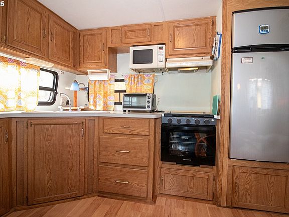 Experience the charm and tranquility of coastal living in the historic town of Florence with this delightful 1995 Kit travel trailer recreational vehicle. perfectly situated in the peaceful, gated community of Coast Village. Tucked away from road noise, this property offers a serene setting. The RV sits beneath a covered Ramada with an extended deck, ideal for outdoor entertaining and summer BBQ'S. An enclosed bonus room off the deck provides additional space for home office or hobby area. Fully furnished and move-in ready (with exception of the Rattan Chair in living room and all area rugs in trailer & bonus room). The RV offers comfortable and convenient weekends away or summer, live year-round. Enjoy added privacy with a lovely Creek bordering the backyard! There is a Clubhouse with pool, exercise area, sauna, playground and garden area and so much more. Coast Village is known for its welcoming atmosphere and well-maintained surrounding making this an affordable and inviting opportunity to own your own place on the Oregon Coast.