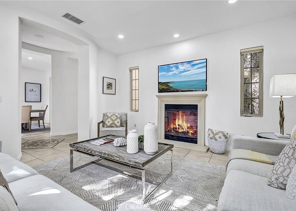 LOCATION, LOCATION, LOCATION! WELCOME HOME TO ONE OF THE BEST LOCATION OF COMMUNITY IN WOODBURY NEIGHBOHOOD. THIS FRESHLY PAINTED STAGED BEAUTY HAS IT ALL. AS YOU ENTER THE HOME THE INVITING GOOD SIZE LIVING ROOM AND ROMANTIC FIREPLACE WILL WELCOME YOU! THE FORMAL DINING AREA ACROSS FROM THE LIVING ROOM IS GREAT FOR ENTERTAINING GUESTS WITH AN ATTACHED PATIO. HUGE KITCHEN WITH STAINLESS APPLIANCESS AND WATER FILTRATION FOR DRINKING WATER. THE PATIO OFF OF THE KITCHEN IS PERFECT FOR ENJOYING YOUR COFFEE EVERY MORNING! THE CONVINIENT BEDROOM DOWN STAIRS WITH A FULL BATH IS PERFECT TO USE IT AS AN OFFICE OR FOR IN LAWS AND GUESTS. AS YOU GO UPSTAIRS THE LOFT AREA IS GREAT TO SET UP FOR A DESK OR LIBRARY. THE SECONDARY BEDROOM UPSTAIRS HAS ITS OWN BATH. THE LAUNDRY ROOM IS ALSO UPSTAIRS WITH THE DRYER INCLUDED. PRIMARY BEDROOM IS VERY GOOD SIZE WITH TWO VANITIES AND ROMAN TUB PERFECT FOR RELAXING AFTER WORK. THIS HOME ALSO IS SET UP FOR SECURITY SYSTEM AND THE GARAGE HAS A NEWER QUIET MOTOR. THIS UNIT IS ACROSS FROM THE PLAY GROUND AND SHORT DISTANCE TO GREAT SCHOOLS, SHOPPING CENTER AND FREEWAY. WHAT A FANTASTIC PLACE TO CALL HOME!
