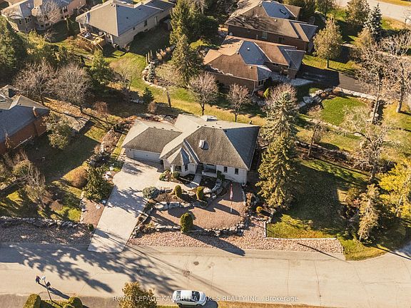 This stately custom built brick bungalow is one of a kind and sits on one of few double lots in the highly desired Port 32 neighbourhood. Impressive curb appeal thanks to the expansive corner lot, extensive landscaping, stamped concrete driveway & walkways, and coveted covered front porch. The home is aprx. 1460 sqft on both levels with 3 bedrooms and 3 full bathrooms. The beautiful kitchen was completely remodelled in 2019 including removing walls to open up the space into the dining & living rooms. Crown moulding was added as well, no expense spared. Off the kitchen is the sunroom and composite deck. The master bedroom has an ensuite and walk in closet. The walkout basement features a large family room, wet bar with a fridge, and both propane and electric fireplaces. There is also a hobby room / den, a large laundry room, and plenty of storage space. Two car attached garage with a workbench & cabinets and stairs to the basement. The spacious grounds, with inground sprinklers, are meticulously maintained and have a park-esque feel thanks to the double lot and mature trees. Pigeon Lake is just across the road. Membership to the Shore Spa Clubhouse is included featuring tennis & bocce courts, a marina, swimming pool, horseshoes, billiard tables, exercise room, library, and more!