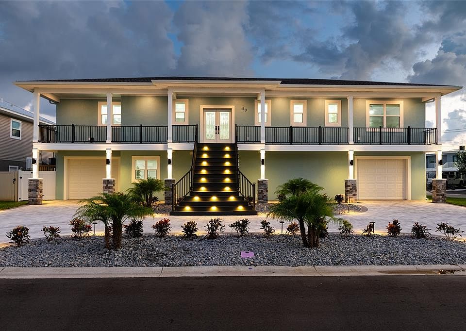New Construction! Beautiful 4 bedroom, 3 bathroom pool home located in one of Dunedin‘s finest waterfront neighborhoods. With all living space built above the floodplain this home has it all, energy efficiency along with the highest quality block construction. Home features include spacious primary bedroom with walk in closet and ensuite bathroom. Kitchen shows fantastic with contrasting custom cabinetry, backlit glass and open shelving, quartz countertops, tile backsplash, all stainless steel appliances with oversized range adjacent to walk in pantry. Spacious second floor laundry with countertop sink for your convenience. Custom trim work highlights the volume ceilings and hurricane windows/ doors. Massive full length covered front porch with grand staircase and composite decking. Rear covered porch highlights tile plank flooring, stained tongue and groove ceiling. Spiral staircase leads to a brand new pool with splash pad and huge ground level paver patio. Lower elevation features a massive three car garage with two entrance doors and a separate one car garage. Ground floor foyer also doubles as an oversized bonus room finished with tile plank flooring and pvc shiplap on walls at chair-rail height. This home is full Masonry construction! New St.Augustine sod, irrigation system and landscape lighting throughout. Backyard is Fully fenced for furry friends!