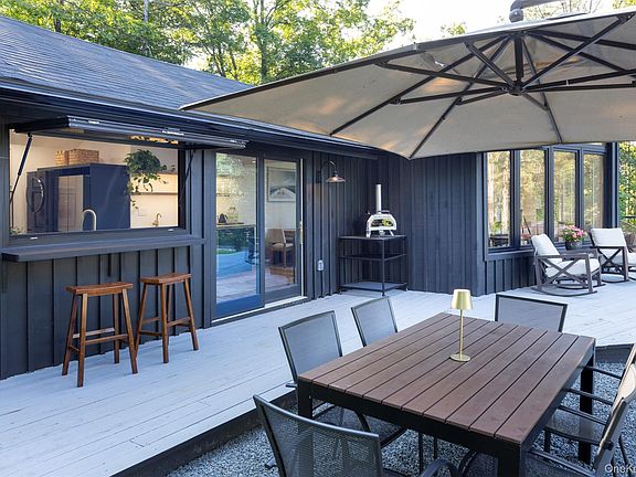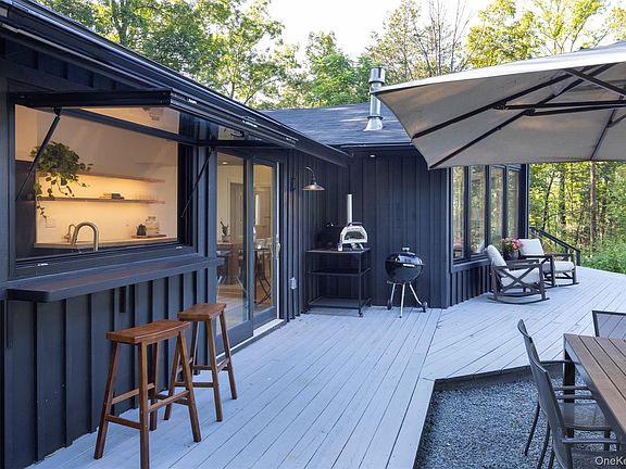 A Private Modern Retreat Where Every Detail is Perfectly Considered Set on 2.23 wooded acres of serene privacy, 83 Sages Loop is a newly reimagined residence where no detail has been overlooked. Completed between 2024 and 2025, this 3-bedroom, 2-full bath home blends crisp modern efficiency with warm, welcoming spaces-offering a perfectly turnkey lifestyle in an exceptional location just minutes from Minnewaska State Park, the Mohonk Preserve, and an easy two-hour drive to NYC. Inside, soaring cathedral ceilings and brand new efficient windows frame the surrounding forest, filling the interiors with natural light and ever-changing views. The heart of the home is a stunning chef's kitchen with all-new appliances, an induction range, a wet bar, and a dramatic 72'' awning window that opens to a breakfast bar-ideal for gatherings that flow seamlessly between indoors and out. Smart lighting and five-zone HVAC, all app-controlled, ensure comfort year-round. Tucked discreetly behind a wall of custom built-in bookcases lies a hidden door-an invitation to step into the home's most magical surprise: a secret bunk room. This enchanting hideaway is perfect for guests, children, or anyone who loves a touch of whimsy and privacy. Two dedicated media setups make movie nights and game days super cozy. The primary suite is a peaceful sanctuary with its own private patio, seating area, and an indulgent outdoor shower. Both bathrooms feature radiant heated floors, with the primary bath offering dual shower heads for a spa-like experience. Impressive Upgrades & Modern Comforts Nearly every surface and system is new, including: Roof, black gutters, and exterior paint (2025) Large Efficient windows (2025) R60 insulation on all surfaces (2024/2025) New mechanicals with 5-zone HVAC (2025) Smart lighting controls (2025) French drain system (2024) Radiant heat in baths and mudroom Extensive landscape design and installation (2025) The oversized 2 car garage offers flexible use as a studio or workshop, with parking for up to six cars on the newly expanded circular drive. The property is also pre-wired with Cat6e for security cameras and audio/video connections throughout. The Best of the Hudson Valley at Your Doorstep Enjoy the peace and quiet of a forested retreat while remaining close to beloved local destinations like Inness, Mill & Main, Arrowood Farm-Brewery, and Westwind Orchard. Whether entertaining, relaxing, or exploring the region's endless hiking trails, farm-to-table dining, and cultural offerings, 83 Sages Loop is a rare blend of modern convenience, natural beauty, and thoughtful design.