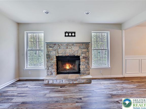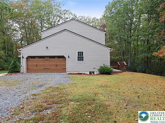 Style, space, and a classic Pocono setting! This 2008-built colonial in Pleasant Valley West delivers mountain-home charm with modern comfort just minutes to downtown Jim Thorpe, Hickory Run State Park, Lake Harmony, and Jack Frost/Big Boulder, with quick Turnpike access for easy commutes. Set on a wooded corner lot wrapped in rhododendron and mountain laurel, the home features a covered front porch, rear deck for grilling, a true two-car garage, and a full unfinished basement for storage or future finishing. Inside, the open layout is bright and welcoming. A stone-faced wood-burning fireplace anchors the living room and flows to an elegant dining area with tray ceiling, wainscoting, and a built-in wine hutch. The spacious kitchen offers a center island, stainless appliances, ample cabinetry, a breakfast nook, and sliders to the deck for indoor-outdoor living. A main-level laundry, mud entry from the garage, and a half bath round out the first floor. Upstairs, the private primary suite impresses with vaulted ceilings, a walk-in closet, and a four-piece bath with dual sinks, jetted tub, and separate shower. Two additional bedrooms share a well-appointed hall bath. Efficient forced-air heat and central air keep things comfortable year-round, and the poured-concrete lower level offers excellent expansion potential. A move-in-ready retreat in a quiet, convenient community; close to restaurants, trails, ski slopes, and lakes. Schedule your tour today!