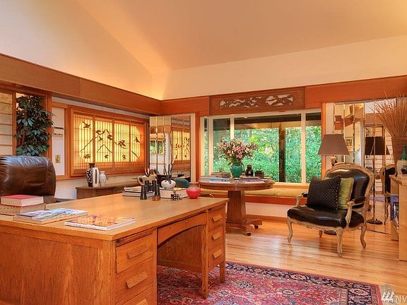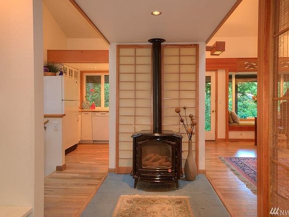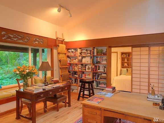 Feel is retreat-like, private. Exquisitely sited amid majestic red cedars, tucked back in the woods and evocative in style of a revered Japanese teahouse, a Fred Groves design unfolds???emerges. Spatially bold and contemporary, yet quiet and contemplative. Easy main-level living. Open-plan, hardwood floors, en suite master BR, walk-in closets, even a walk-in pantry. Grand-scale windows and roof-peak skylights lure the outdoors in???stunning natural light daylong! Plus: spacious studio/BR/hideout.