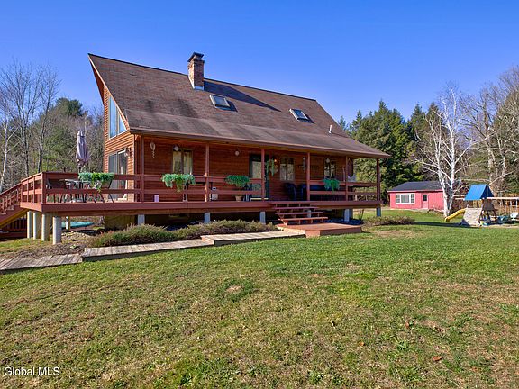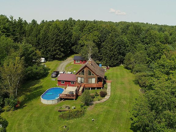 Sensational country living in one of the Northeast's best kept secrets is all yours! This picture-perfect chalet-style home sits on 15.20 gorgeous acres where New York State meets VT in historic Granville. The 3-bed/2.5-bath home spans 2,400 sqft. & is perfectly situated on a rise. Amazing sunlight & views starting w/ a wraparound deck. Double-height wall of windows in the family room w/ oversized fireplace sets the tone. Chef's kitchen w/ breakfast bar, dishwasher & stainless appliances. Loft area upstairs, hardwoods, ceramic tile floors. There's a deck, pool, lower-level laundry, woodstove, garage & second outbuilding. 2 garage (North and South) of the property. South garage driveway is shared access w/ neighboring home. Property has multiple trails for outdoor activities. Don't miss!