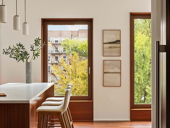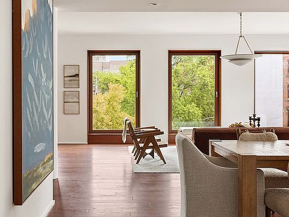 Residence 5 is a one-of-a-kind full-floor 4 Bedroom home with incredible light and panoramic city views. The spacious 3,323 Sq. Ft. layout features an enormous corner great room with large eat-in kitchen and center island, including mahogany cabinetry, luxury appliances, and unique lavastone countertops. The home is lined with oversized wood-framed windows that look out across a tree-filled pocket park with open skies above and the midtown skyline beyond.