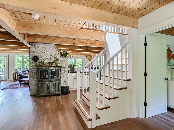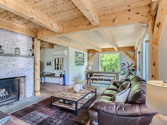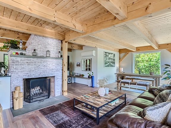A great opportunity to move right into this stunning post and beam home conveniently located just outside of Vineyard Haven. This 3 bedroom 3 bathroom property on 1.3 acres was fully renovated from top to bottom in 2019 to give the feeling of a brand new home. A light open living space occupies the first floor with Cherry hardwood floors, brick fireplace, modern gourmet kitchen, guest bedroom with full bath, plus a powder room. There are 2 sets of doors that lead out to the sunny wrap around deck. Upstairs there is a huge primary suite, with vaulted open post and beam ceiling, full bathroom, walk-in closet and office nook. This floor benefits from views over the treetops towards the north shore that have glimpses of the water and stunning sunsets. The basement level is walk out with its own private parking and entrance, plus a private deck for outdoor relaxation. The studio space comprising bedroom/living area and full bath is also accessible from an interior staircase. The systems room, and laundry is also on this level. Heat/AC is provided by mini splits on the first and second floor and there is radiant heat in the first floor and lower level. Outside you will find plenty of parking and a lovely open lawn area with mature plantings. Plus a freestanding outdoor shower. Move right into this beautiful finished home, minutes from town and a short stroll to the Black Dog.