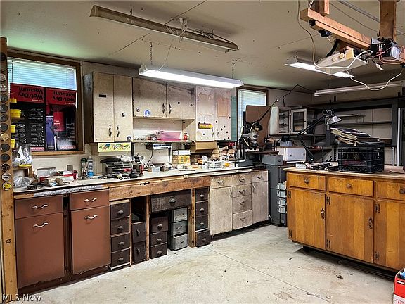 Garage, workshop with a loft, boat garage, shed... Need storage? Calling all Tinkers, collectors and hobbyists. This one is for you. 3-bedroom, 2-bath, 2-story in great shape but could use some updating. Lower level has a 2nd bathroom and full walk out basement with Bilco doors. Mud room off the back, enclosed porch off the front. Kitchen and laundry appliances plus dehumidifier are included. Out back find a 2-car extra deep garage w/ side porch, huge workshop with an additional overhead door, storage room, huge walk up loft, shed out back and a 12 x 32 boat or RV storage pole building. Paved drive, extra parking and central air. 3/4 mile to Lake Erie boat launch, public beach and park, restaurants and more.
