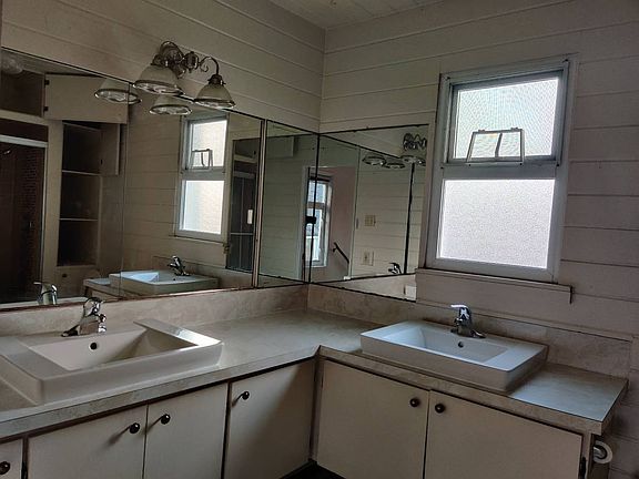 Bathroom is equipped with Moen faucets and vessel style basins for his and hers