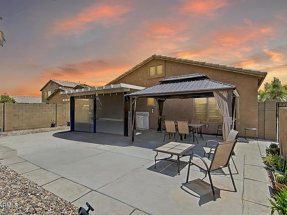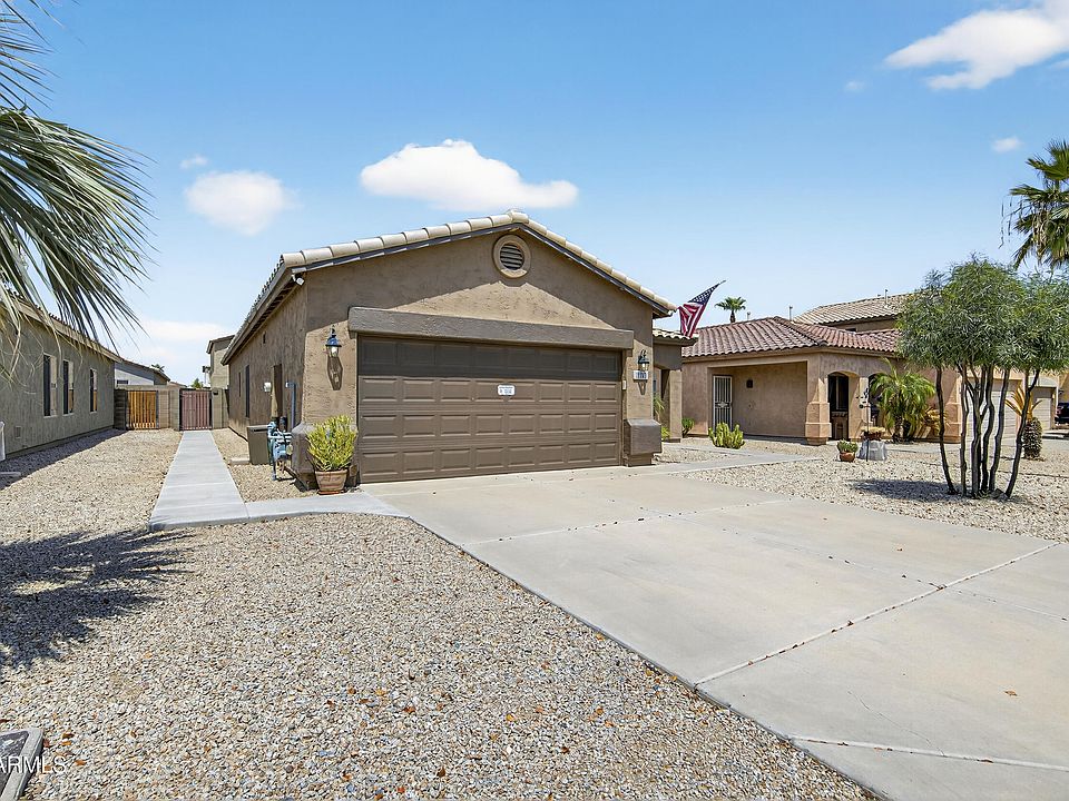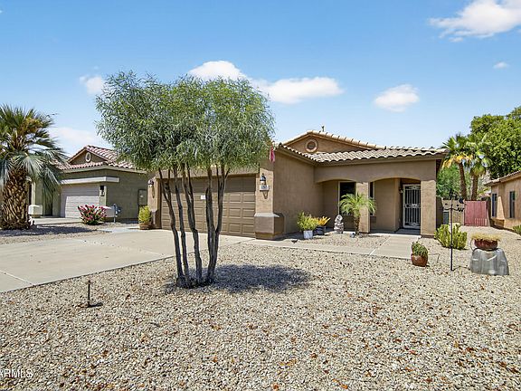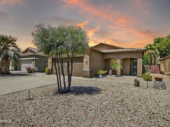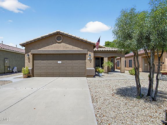 Beautifully maintained single-level home in Johnson Ranch featuring 3 bedrooms, 2 bathrooms, and 1,631 square feet of living space. The open great room floor plan offers a bright and functional layout, complete with tile flooring. The primary suite is well-appointed with a walk-in closet and double vanity in the bathroom. Additional highlights include a 2-car garage, owned water softener, solar screens, and inside laundry. The backyard is designed for low-maintenance living with gravel landscaping, a covered patio, and a private above-ground pool. Located in the desirable Johnson Ranch community, residents enjoy access to multiple pools, golf, pickleball, playgrounds, and scenic walking/biking paths. Conveniently situated near schools, shopping, and dining.