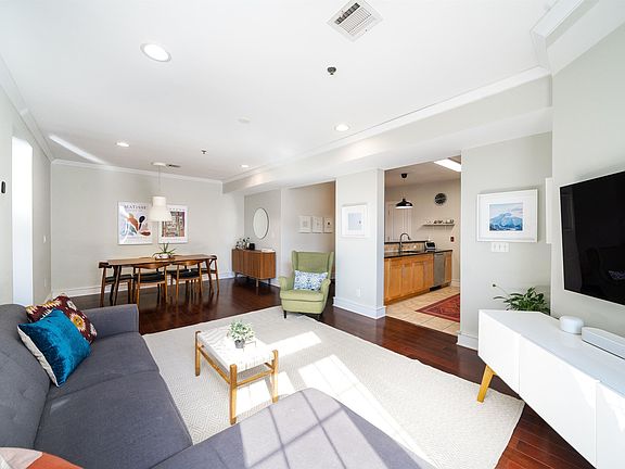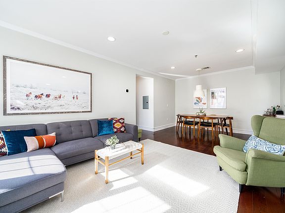 Bright and spacious two bedroom / two bath 1200 sq ft condo has an ideal layout in Fields Crossing, a centrally located elevator building with deeded parking, exercise room, and common outdoor space. The large kitchen features abundant cabinetry and granite counters, recently updated stainless appliances including Samsung 4-door refrigerator, LG dual-zone range, and Bosch dishwasher. The expansive, sunny living room offers plenty of space for entertaining, along with the generous dining room area that seats 6-8. The primary bedroom suite features a sleek en-suite bathroom with large glass shower and a generous walk-in closet with Elfa shelving. The second bedroom also has ample closets. Both bathrooms were fully renovated in 2021 with stylish custom tiles, vanities and fixtures. This home also boasts beautiful hardwood floors, custom lighting fixtures, central air / heat with Ecobee smart controller, in unit LG washer/ dryer, and oversized walk-in coat closet & storage. EV Charger installed in deeded parking spot #8. Ideally located across the street from the Light Rail, Citibikes, close to NYC bus stops, the popular Monroe Center, supermarkets, dining, several parks, daycare centers and schools.