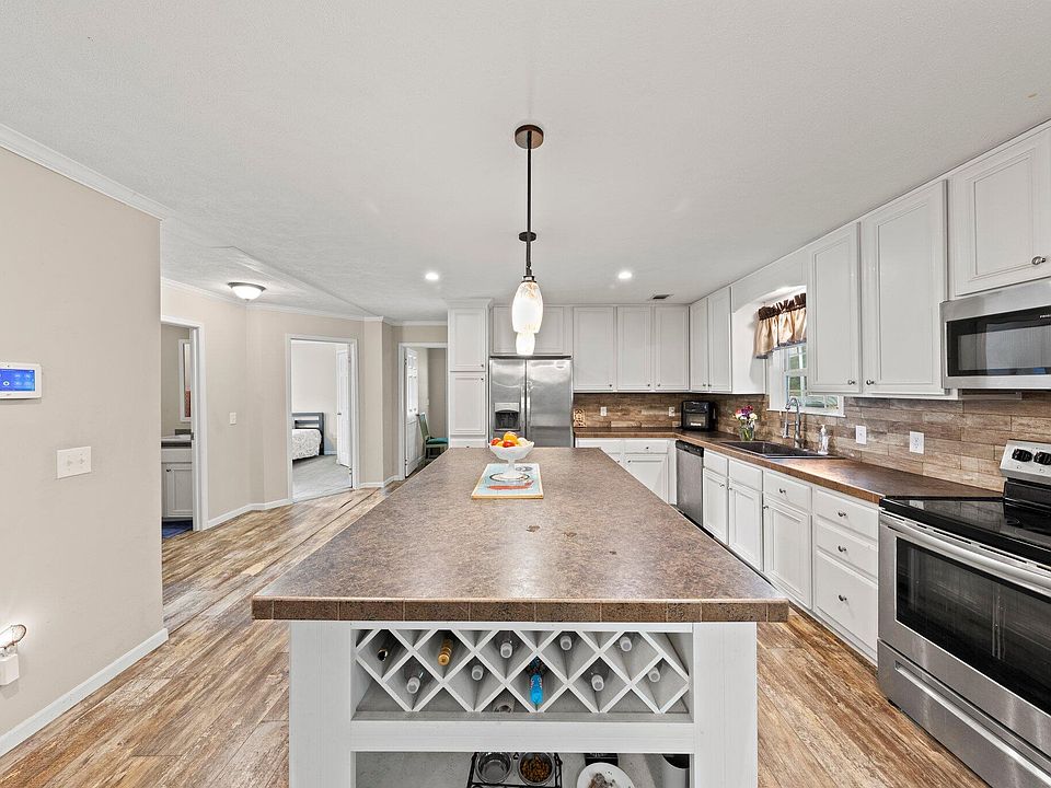 Escape to Tranquility! Experience the Beauty of Juniper Lake from Your Hilltop 3 bedroom 2 bath farmhouse-style manufactured home nestled amongst the pine trees, providing captivating glimpses of the Lake. Once you step inside you will discover a spacious open layout, perfect for everyday living. The kitchen is the heart of this home, with it's huge center island with wine and pan storage, complemented by sleek stainless steel appliances and lots of cabinet space, including a farmhouse sink. Need more space? Entertain effortlessly as the kitchen flows into the inviting dining and living areas, with 2'' faux wooden blinds and a cozy fireplace making it perfect for the holidays. Retreat to the private master suite, or soak in a lavish garden tub, or the beautiful tiled shower. Two additional bedrooms and a shared bath are on the opposite side, and this split-layout design ensures both privacy and convenience. Imagine yourself on the huge screened deck sippin your favorite cold beverage, complete with sliding barn doors, amongst the beauty of pine trees. Washer and Dryer will be included with purchase of this amazing house! Call your favorite Realtor today for a showing!