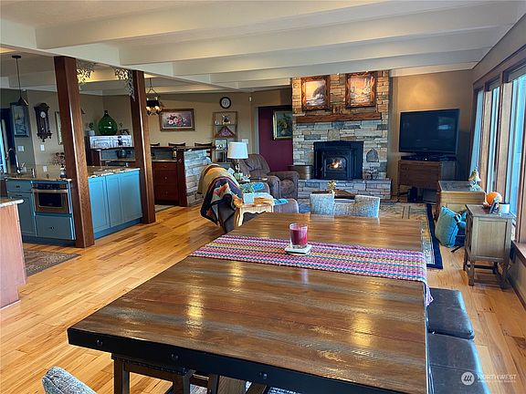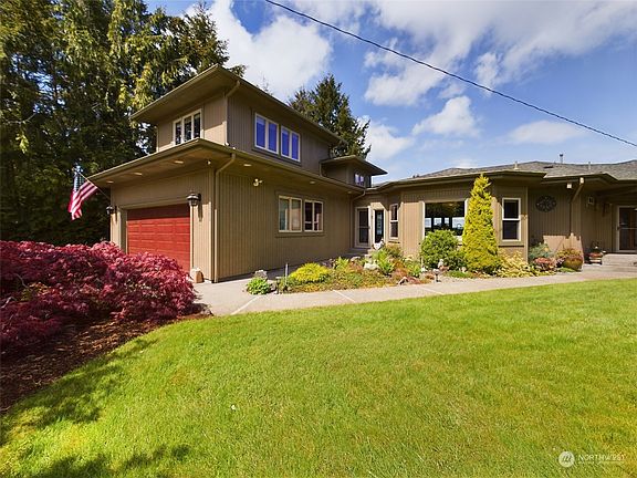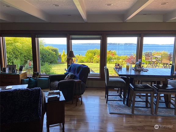 Enjoy breathtaking views of Puget Sound from your own hot tub atop this exceptional waterfront property . Luxury defines every detail from the gourmet kitchen in designer colors and two islands with granite counters to the outdoor fireplace covered porch. The master suite features walk-in closets, a cozy fireplace, bath has two sinks and tiled walk-in shower. Work from home with sweeping views in the home office, and enjoy the bonus heated bedroom and versatile extra room. Nearly every room boasts waterfront views. Both attached and drive through detached garages with shop. Outside, master gardens surround this estate with 100 ft. of beachfront with tidelands and staircase to bulkhead. This home offers coastal living at its finest.