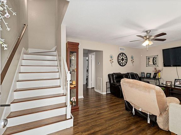 Welcome to this beautifully maintained 2-bedroom, 1.5-bath townhome offering comfort, functionality, and modern appeal. The open-concept living area features rich wood-style flooring, neutral tones, and abundant natural light, creating an inviting atmosphere.The updated staircase and thoughtful layout enhance the flow between the living, dining, and kitchen areas—perfect for both relaxation and entertaining. Upstairs, you’ll find two spacious bedrooms with generous closet space and a full bathroom, while the convenient half bath downstairs is ideal for guests.