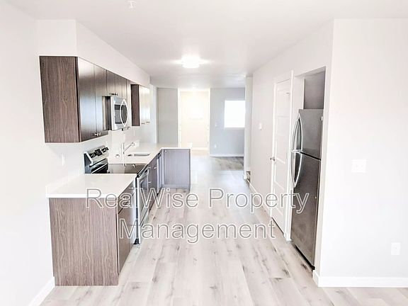 Tentatively available mid-August. One small to medium-sized pet may be considered upon approval with an additional $500 deposit and $35 monthly pet rent. This charming end-unit townhouse is a must-see! The welcoming two-bedroom, one-bath layout features an open living room, kitchen, and dining area enhanced with custom paint and stylish flooring. The kitchen comes equipped with a range, refrigerator, dishwasher, and microwave. Both bedrooms are located upstairs, and a full-sized washer and dryer are included. The home offers electric heat and a downstairs AC unit. Outside, enjoy a fully fenced backyard with a covered patio, ideal for relaxing or entertaining. One designated off-street parking space is included. Backyard landscaping is the tenant's responsibility. Water, sewer, and garbage are included; tenant is responsible for all other utilities and services.