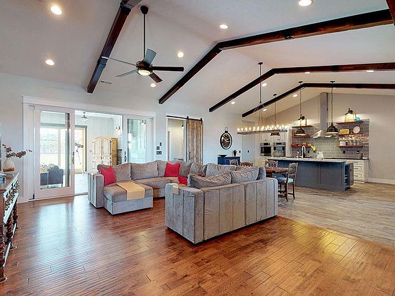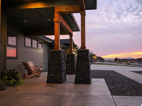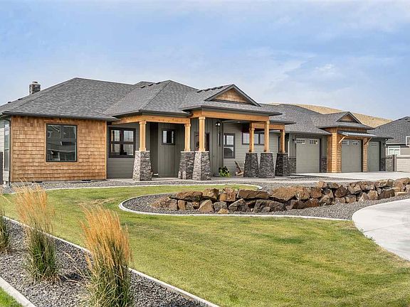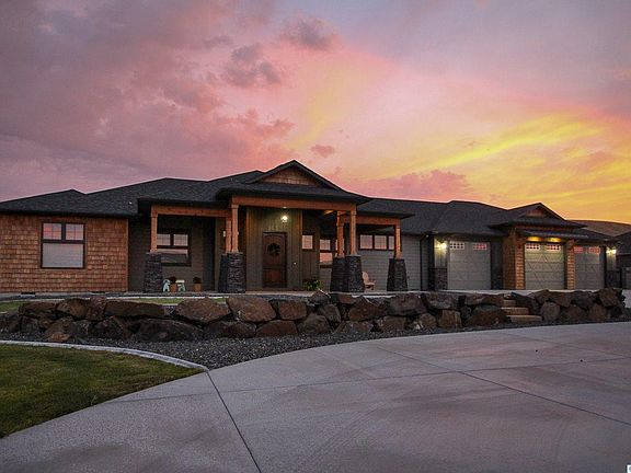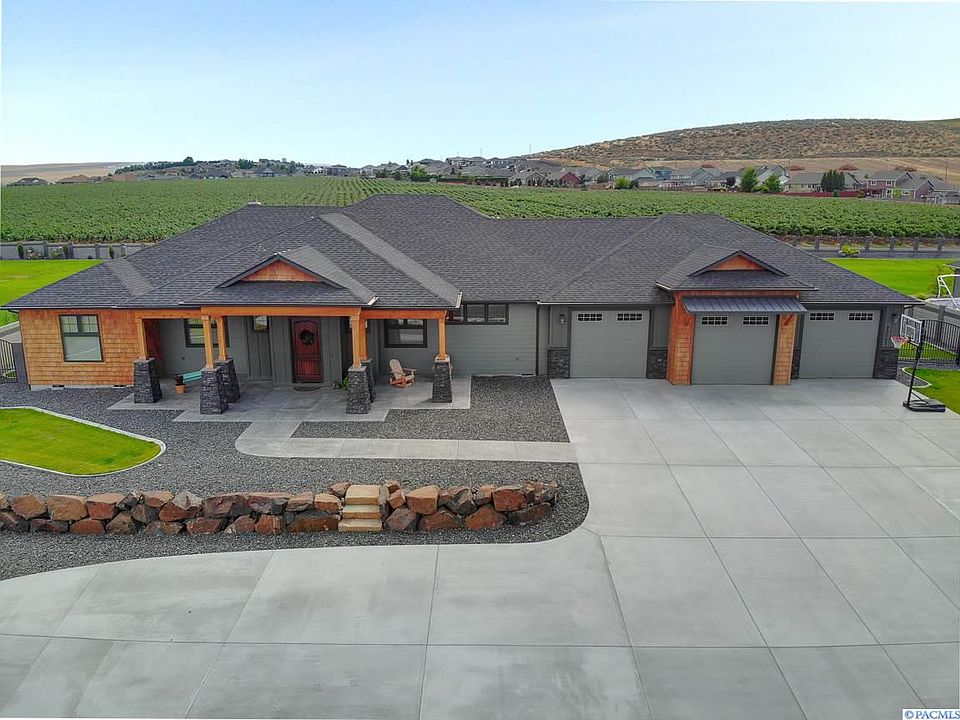 Absolutely gorgeous 5 BR 3 BA rambler with bonus room and a view on huge SW Kennewick lot with 6+ car garage! This one-of-a-kind rambler offers spacious great room living, vaulted ceilings with wood beam accents, stylish barn doors, wood floors, lots of tile, and dream sun room. Perfect home for year-round social/family gatherings--entertain in style with the large great room open to gourmet kitchen boasting oversize island with dining bar, Bosch stainless steel appliances, ample storage, coffee/wine bar nook, dining area, plus large walk-in pantry! Anderson sliding doors in the 26x20 sun room with masonry wood burning fireplace and venting for future indoor kitchen. Luxurious and private master retreat complete with oversize walk-in closet, dual vanities, tile galore, soaking tub, walk-in shower, and attached den/office/sitting room. Generous secondary bedrooms, half bath, large main bath, and 26x14 flex space with extra storage and farm sink--great for rec room, workout space, dance/artist studio, or even a fifth bedroom. Large .84 of an acre lot fully-fenced with block wall/wrought iron and backing up to vineyard. Large open patio and plenty of space to add a pool and shop. Attached 6+car garage (3 tandem bays) with roll-up landscaping door, semi-circular driveway, and extra off-street parking. Oversize, covered front porch provides ample shade throughout day for comfortable relaxation. Take in the amazing sunset views from front porch or backyard--this stunning property is a must to see.