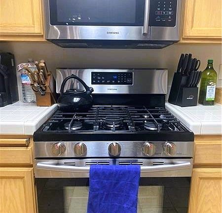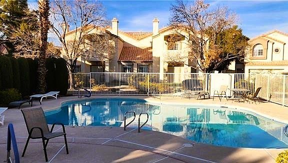 Spacious Condo with over 1521 sq ft. Bottom unite with attached 2 car garage. Property features 3 bed 2 full baths and open concept with dining area. Newer A/C and all other appliances in great shape and will convey. Primary bedroom features a walk in closet, nice bathroom with double sinks, big separate tub and shower with upgraded stone floors. Kitchen has nice size breakfast counter, plenty of counter space and open to the living / dining area. French doors out to the back area- both in the main living area and thru the primary bedroom! Gated Community with 2 Resort style pools w spa near the Summerlin Tivoli Village , Angel parking and shopping.