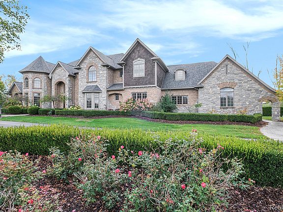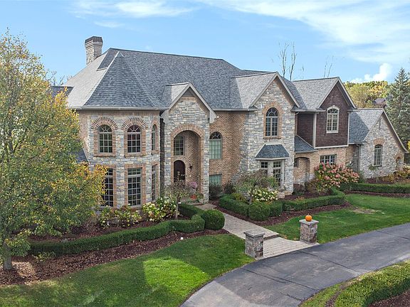 This exceptional 5-bedroom, 5-full-bath, 2-half-bath English manor–style residence offers over 5,758 sq. ft. of refined living space, paired with an additional 3,000 sq. ft. of beautifully finished lower level designed for effortless entertaining and luxurious everyday living. A resort-level outdoor oasis unfolds across the grounds—an amazing inground pool framed by stone paver patios, a pagoda-style outdoor bar and kitchen, multiple gathering patios, a built-in fire pit, basketball court, and immaculate, artfully curated landscaping. The impressive 4-car garage with rich wood-paneled doors and a stately horseshoe driveway elevates both convenience and curb appeal. Inside, sunlight fills every corner through abundant windows, enhancing the home’s neutral, timeless aesthetic. Large rooms and soaring ceilings create an atmosphere of elegance. The living room centers around a beautiful fireplace and a custom built-in bookcase, while an iron-spindled open staircase adds architectural sophistication. The gourmet kitchen is a chef’s dream: commercial-grade stainless steel appliances, granite surfaces, an oversized granite island, artsy custom backsplash, extensive cabinetry, pantry, butler’s pantry, and a charming custom breakfast nook overlooking the pool and patio. A main-level laundry center enhances practicality as well as a second level laundry center. The home office is truly impressive—soaring ceilings, a full wall of windows, and an expansive built-in bookcase make it an inspiring place to work. The primary en suite feels spa-like, offering an oversized open walk-in shower with tile bench seating, a glass block window, soaking tub, and generous walk-in closets. All bathrooms throughout the home feature tile and granite finishes for a cohesive high-end feel. The finished lower level is entertainment at its finest, complete with a billard room, a large great room with wet bar , a fun home theatre room, and scenic views from every window. Custom touches throughout make this home truly unforgettable—a grand, beaut
