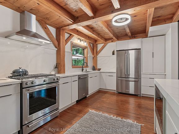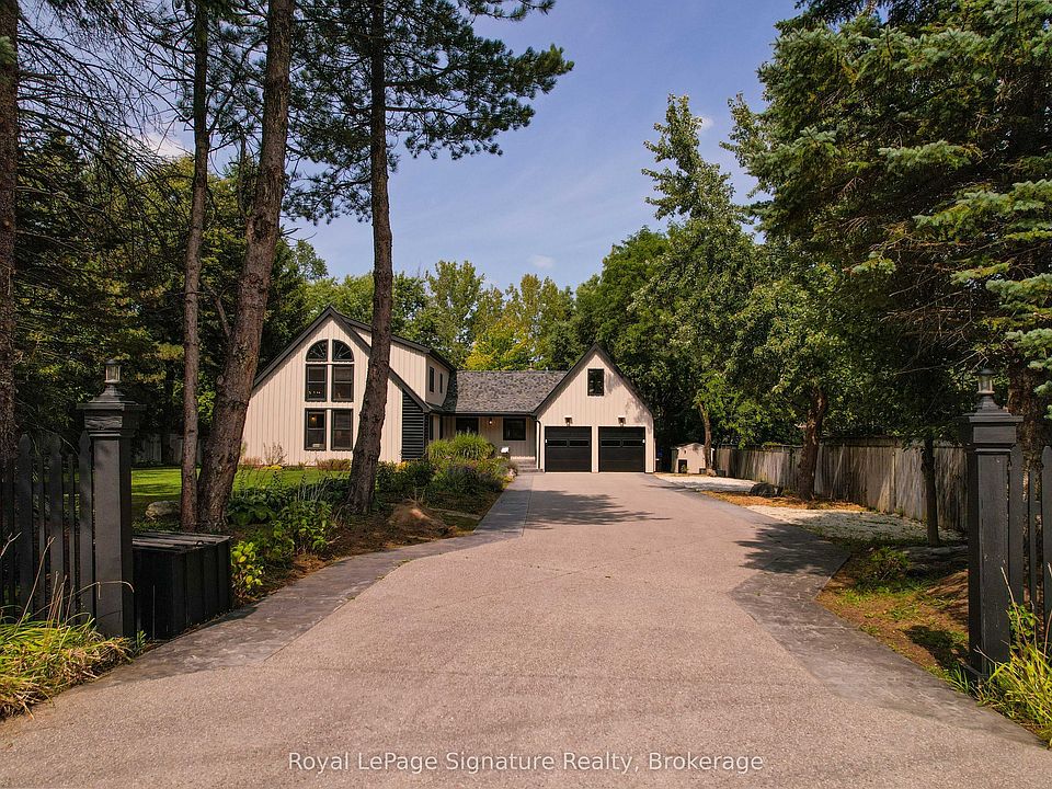 Tucked away on a private, tree-lined lot in the desirable Collingwoodlands community, just minutes from Osler Bluff Ski Club and the vibrant town of Collingwood, this stunning board-and-batten home is a haven for four-season living. Whether you're carving fresh powder in the winter, hiking scenic trails in the spring, paddling Georgian Bay in the summer, or enjoying the brilliant fall colours, this property offers the ultimate recreational lifestyle.The homes timeless post-and-beam construction and soaring ceilings create a warm, alpine-inspired ambiance, while thoughtful modern renovations bring a sophisticated edge. At the heart of the home is a chef-inspired kitchen featuring quartz countertops with a striking waterfall edge, matching backsplash, sleek custom cabinetry, and all-new appliances, perfect for après-ski gatherings or casual weekend entertaining. With over 3,600 square feet of finished living space, the interior has been fully refreshed to offer comfort, functionality, and refined style. The natural wood accents throughout bring the outdoors in, echoing the beauty that surrounds the property. A standby generator ensures peace of mind and uninterrupted comfort no matter the season. Offering both seclusion and convenience, this home is ideal for active families or weekend adventurers looking to embrace everything this four-season playground has to offer. From ski hills and cycling routes to golf courses, beaches, and charming local shops this is where lifestyle meets luxury in every season.