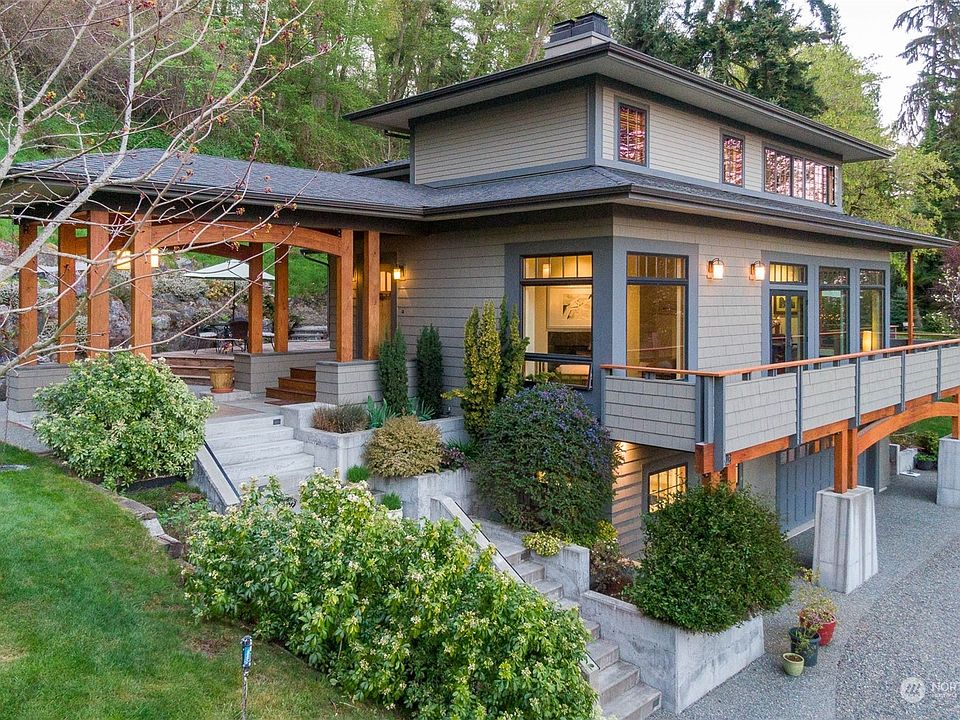 Exceptional living in this stunning NW Contemporary home w/lovely views of Puget Sound, Mt Rainier & city lights. Park-like setting w/exquisite landscaping, lush irrigated garden beds, quiet sitting areas, & variety of flowering plants/trees. Architecturally designed home offers beautiful design elements, tall ceilings, expansive view windows, light-filled rooms, tigerwood floors, custom built-ins, 2 fireplaces, elegant finishes & artisan touches. Multiple decks perfect for entertaining, enjoying the breathtaking views & enjoying the Caldera Saltwater hot tub. Home features beautiful great room, kitchen w/dining, cozy den, office, studio, & 2 car garage with finished room w/ bathroom. Fantastic location! Perfection!