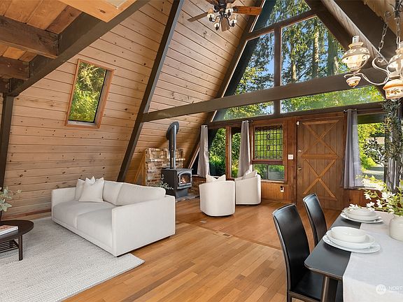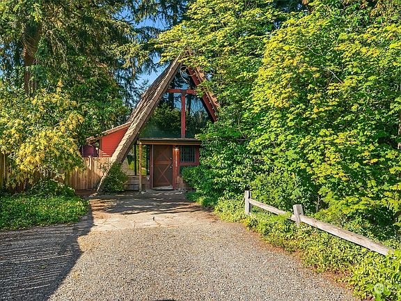 Nestled on an idyllic, over 14,000 sqft lot, this charming A-frame home is enveloped by native trees ensuring exceptional privacy. The wood-lined interior, complemented by soaring ceilings, a wood stove, skylights, and a wall of windows creates a serene cabin-in-the-woods ambiance with an abundance of natural light. The detached 2 car garage features a finished bonus space complete with a bar and a wood stove. Enjoy ample parking options including the garage, a covered parking canopy, and driveway space ideal for your RV, boat, and more. A massive patio overlooks the backyard and includes a firepit and plenty of space to entertain. The home's electrical system was updated in recent years. Close to Heritage Park, WA 512, and many amenities.