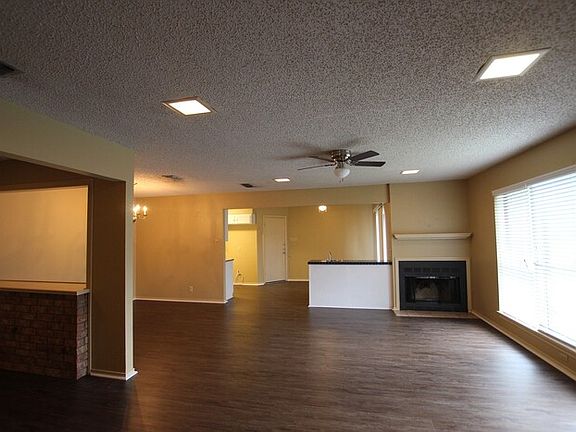 The larger primary bedroom provides ample space and comfort, while the additional bedroom and guest bath make this home ideal for a small family or roommates. The living room offers a cozy fireplace, beautiful wood-look flooring, and window blinds for a warm, polished touch.