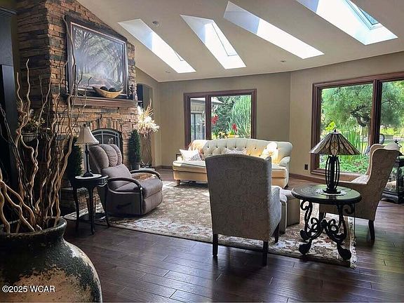 Open floor planTwo storage shedsKitchen with granite countertopsCustom cherry built-insVaulted ceilings with skylightsStone gas fireplaceLarge walk-in closet