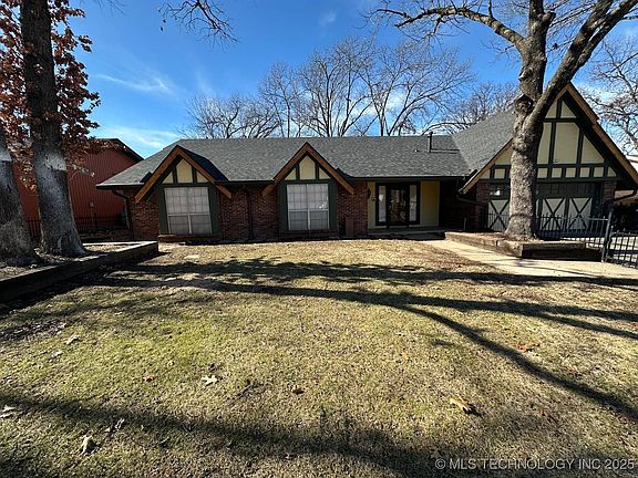 Brookwood single story in the heart of South Tulsa! Home features 4 SPACIOUS bedrooms, 2.5 baths, and 2 car garage. FABULOUS open concept, vaulted ceilings, dry bar, built in bookcase and a corner fireplace. You'll enjoy plenty of natural light from the doors of the living room which open to a large deck. PERFECT FOR ENTERTAINING! Formal dining room has great outdoor views as well. Spacious kitchen with tile brick flooring, pantry, double oven and an eat-in nook. Laundry room with half bath and sink. Hot water tank 2022. Mature trees and fully fenced. Quick access to shopping, restaurants and highways! JENKS EAST SCHOOLS!