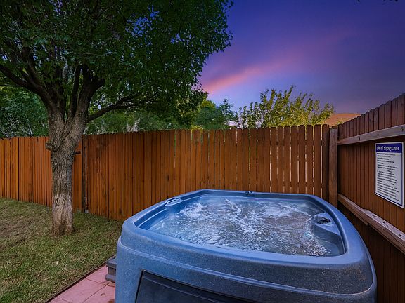 There is also a fully fenced, private backyard for you to enjoy. It has a paved patio with outdoor furniture as well as some trees for shade. And a hot tub for relaxation.
