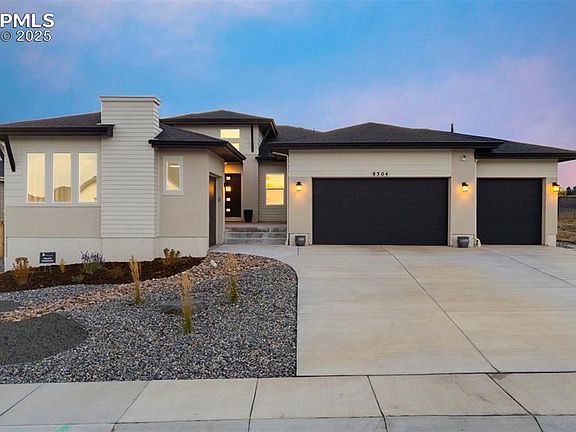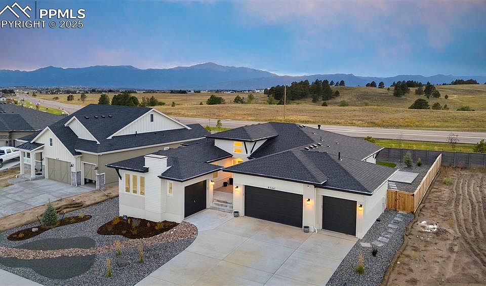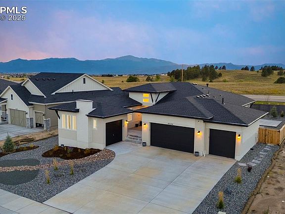 Absolutely stunning and like-new, this 4-bedroom, 3-bathroom, 4-car garage home is now available in North Colorado Springs. From the moment you arrive, you’ll be captivated by its incredible curb appeal, featuring a fully landscaped, level lot and a striking black and white stucco exterior. A spacious front courtyard leads to a sleek, modern front door, setting the tone for the stylish interior that awaits. Inside, you're welcomed by an expansive open floor plan with LVP flooring throughout. The living room features a floor-to-ceiling stone fireplace, creating a dramatic and eye-catching focal point. From there, the space flows seamlessly into the gourmet kitchen, complete with beautiful matching marble countertops and backsplash, stainless steel appliances—including double ovens and an industrial-style vent hood—and an oversized island with seating for six. Modern brown cabinetry paired with elegant custom gold hardware adds the perfect finishing touch. A spacious dining area sits just off the kitchen, ideal for daily meals or entertaining. Natural light pours into the main level through oversized windows and large double sliding glass doors, leading to a covered patio and a beautifully maintained, fully fenced backyard. Also on the main level is a stylish office with custom wainscoting. As well as a secondary bedroom and full bathroom, and a luxurious primary suite. The primary retreat features a spa-like 5-piece en suite bathroom with unique modern tile, bold black fixtures, a standalone shower, a stunning soaking tub, and a large walk-in closet. The finished basement expands your living space with two additional bedrooms, a full bathroom, and a massive entertainment area offering endless possibilities—from a media room to a home gym or game room. Built in 2025 with numerous upgrades and refined modern finishes, this home offers warmth, style, and functionality at every turn. It’s move-in ready and sure to impress—schedule your showing today before it's gone!
