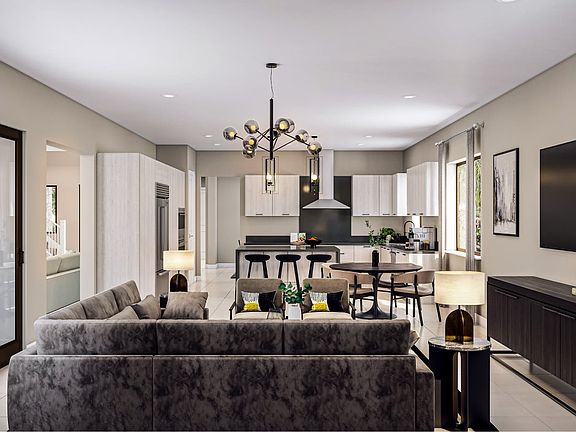 At the heart of this two-story home is a spacious formal living room, offering direct access to a covered terrace and dining room. At the back of the home, the spacious kitchen with island shares a footprint with the breakfast area and family room for casual living, while a game room and secondary bedroom provide additional space. Four more bedrooms surround a versatile loft upstairs, including the luxurious owner's suite.