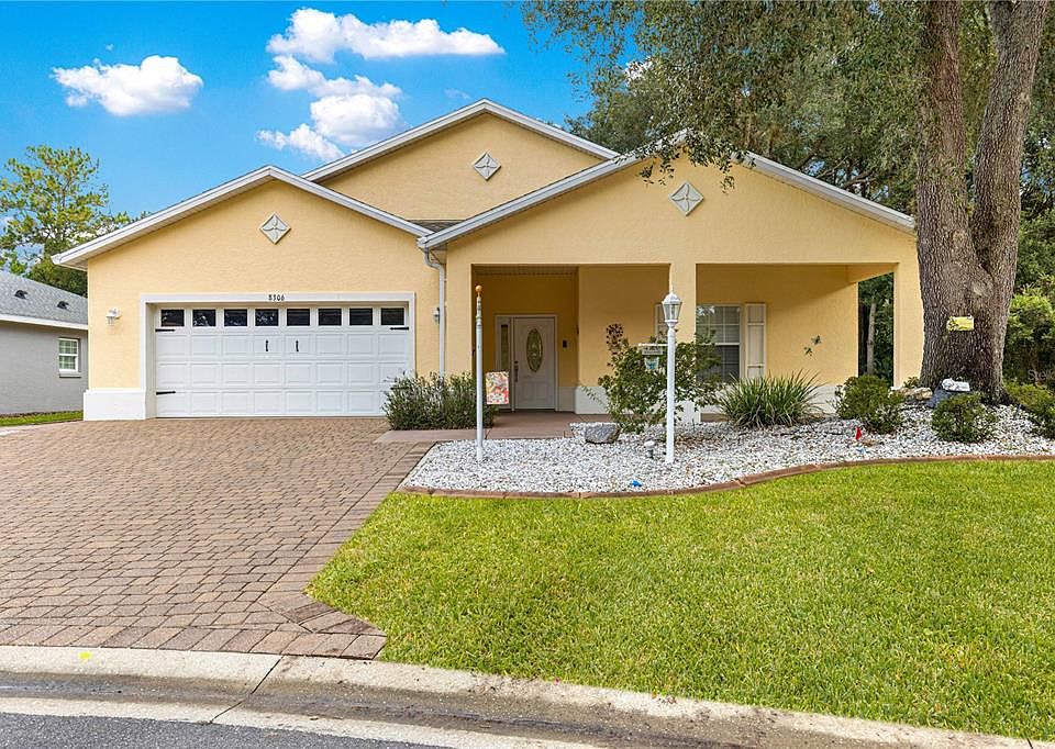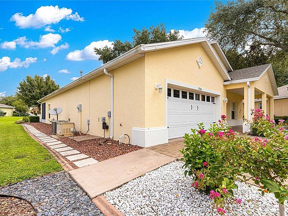 Indigo East Home with Casita: Welcome to this unique Hydrangea model tucked away on a quiet street in the sought-after Indigo East neighborhood of On Top of the World, Ocala’s premier gated 55+ community. This beautifully appointed 3-bedroom, 3-bathroom home features a spacious 2-car garage, a paved driveway, and a fenced backyard. One of the bedrooms, bathrooms, and kitchenette is located in a private guest casita—perfect for visitors who will enjoy the luxury of their own suite, separated from the main residence by a serene, screened tropical courtyard with raised stone planters, an outdoor bar and built in water fountain. Inside the main home, the chef’s kitchen boasts white cabinetry with crown molding, granite countertops, a large prep island, a generous pantry, a backsplash, and stainless-steel appliances. The open floor plan includes 18x18 tile flooring throughout the living areas, with vinyl flooring in the bedrooms for an updated look. Plantation shutters on all the windows and crown molding throughout the house provide a streamlined effect. One living room wall is floor to ceiling stacked stone with a built-in electric fireplace adding a unique touch. An oversized indoor laundry room offers built-in cabinets for extra storage and an extra sink. The primary bedroom features double walk-in closets and an ensuite bathroom with dual vanity sinks and a large walk-in shower. Step outside to your private backyard oasis, ideal for peaceful mornings or entertaining guests. Enjoy privacy from the lanai or relax on the patio surrounded by lush, fully sodded, and irrigated landscaping. This home also offers the convenience of curbside trash and mail service. A new roof was installed in 2022, and a new AC compressor was added in 2023. As a resident of Indigo East, you’ll enjoy all the amenities—including golf cart access to three shopping centers, two pools, Indigo Fitness Center, Indigo Community Center, walking trails, an outdoor fitness park, and a dog park.