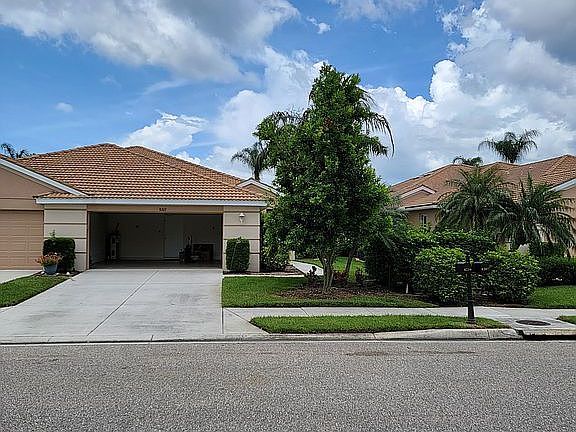 Stoneybrook @ Heritage Harbour Gated Golf Community! Enjoy captivating water views or watch TV while relaxing in your private in-ground saltwater pool/spa (extended lanai). This stunning villa has NEW tile throughout the kitchen, living room, family room, utility room and bathrooms. The split bedroom floor plan provides the convenience of privacy while you retreat to your spacious master bedroom with walk in closet and NEW carpet. Bright and sunny villa includes plantation shutters so you're in control of how much light enters your home. Great open kitchen with substantial cabinet space, pantry and breakfast bar. Interior is freshly painted. A/C is less than 5 years old and washer and dryer are less than 5 years old. Attached 2 car garage with attic access. Extra amenities include: New crown and base molding throughout. New tile and carpet throughout. Plantation shutters. Bose surround sound in living room and outdoor speakers. Updated vanity lights. Fresh paint. Updated appliances. Fans throughout. Maintenance stress-free villa! 18 hole Arthur Hills championship golf course (no mandatory fees), resort style heated pool and spa, fitness center, pickle-ball, tennis, volleyball, basketball, soccer and baseball fields, dog parks, picnic areas, playgrounds, biking and walking trails, restaurant, etc. Close to UTC Mall, beautiful beaches and Sarasota, St. Pete, Tampa airports. Original owner; lived there part-time so home is immaculate. HOA FEE INCLUDES LANDSCAPING, ROOF, EXTERIOR PAINT, DRIVEWAY POWER-WASHING, ETC. Golf membership is not mandatory.