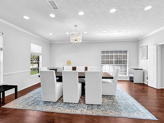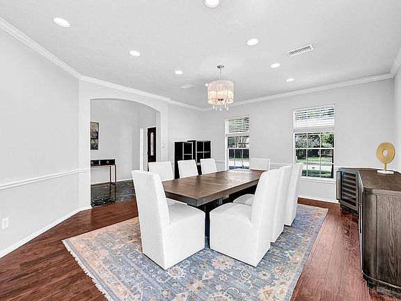 Fire placeWood laminate floorsLarge dining roomCovered patioJetted tubNice sized game roomWalk in closet