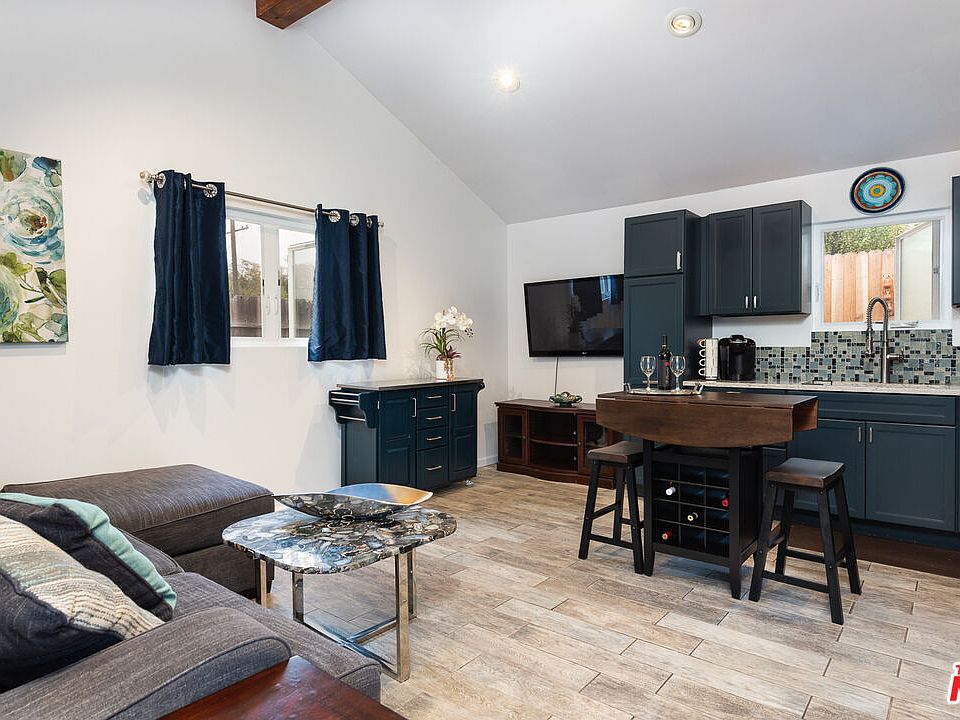 FULLY FURNISHED GUEST HOUSE with high vaulted ceilings in the living room & bedroom. This guest house/ADU is detached from the main home on the back of the lot with privacy and a lovely shared patio area. The kitchen is a cooks delight with a moveable dining island. Full size washer/dryer. This location is so close to all of LA's great amenities -beaches, fine dining and LAX airport. Easy freeway access towards downtown and the south bay too. Tenant to provide their own TV and internet service. Prescreened applicants with excellent credit/ references please. Small Dogs will be considered. Renters Insurance Required before move in date. Utilities will be prorated. On street parking.