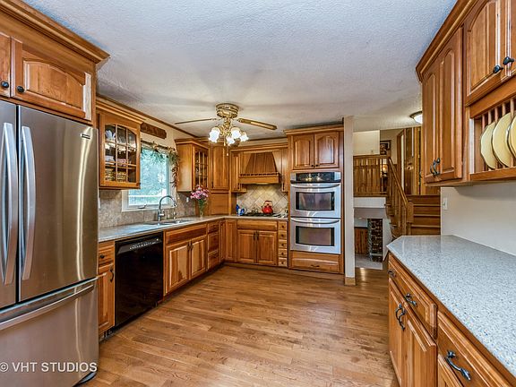 Beautiful fall colors welcome you to this lovely horse property that is private and secluded with the high school that is ranked in the top 10% for the last 10 years straight with US News and World Reports. This home is a tri-level with sub basement, hardwood floors, three bedrooms, 2 1/2 baths, family room, sunroom, two wood burning fireplaces and a wood burning stove. As you enter this home the open living room with oak floors, bow window and lovely stone fireplace welcomes you to cozy winter nights. A large dining area with french doors that lead to the sunroom with ceramic floors, a wood burning stove that is a Vermont Intrepid and a room full of windows to take in all the beautiful views of nature with the garden and the koi pond with a 40 ft stream flowing through it, takes your breath away. The kitchen has natural cherry cabinets with quartz counter tops plus extra cabinets for your cooking needs. Stainless steel appliances, built in double convection oven and gas cooktop. Newer windows that are easy to clean. New roof, siding and gutters with transferable warranty in 2022. Newer GFA furnace and two stage air conditioner unit. New carpet in two bedrooms. Master bedroom has it's own master bathroom and walk in closet. Six panel doors throughout the house. Great lower level family room with a full brick wood burning fireplace with look out windows. What a great room to watch the leaves come down on a cozy fall night. Also you have a half bath and a playroom and an office area if you want all in the lower level. Don't forget you have the sub basement for storage or a workshop. Come on now let's go outside remember there are almost 2.50 acres here. There is a 30 x 40 horse barn with 3-5 stalls with water and electric. Also the barn has a tack room and hay storage area. Complete fenced pasture and paddock attached to the barn. Chicken/potting shed, lots of perennials, fruit trees, grape vines, and tappable Maple trees. Plus gardens for vegetables ready for next years planting you can live on your own land here. The subdivision has several miles of private trails right out the back of the pasture. Also several nearby riding areas. (Chain O'Lakes State Park, Glacial Park, among others.) Greenhouse on property is negotiable. Fans in Barns are also negotiable. Come on out and fall in love with your new home away from the big city. But still be close to all the conveniences like shopping, restaurants and entertainment. Price reduced. Sellers will look at all offers.