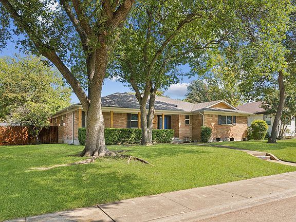 Welcome to this thoughtfully renovated single-story home, tucked in an established neighborhood with mature trees and timeless curb appeal. Upon entry, a flexible front living area with plank flooring offers flexibility for an office space, play area, dining + more. Continuing left through the room, the updated galley kitchen is bright + functional featuring updated stainless steel appliances + gas cooktop. Connects seamlessly to a cozy breakfast nook, and flows into the spacious family room. A true centerpiece -- vaulted beamed ceilings, a striking floor-to-ceiling brick fireplace, and custom built-ins. The large glass sliding doors open to the backyard, creating natural openness and light. On the right side of the home, a charming full bathroom complete with a shower bath combo has two entries, one to the hallway and one to the first bedroom. An additional bedroom is great for a growing family or guests. The spacious primary suite includes a sliding barn door leading into a modern en-suite bath with dual vanities, separate shower + lighted mirror. Outside you'll enjoy a private backyard with an open patio, two storage sheds, and a convenient rear-entry two-car garage + electric gate. Thoughtful updates and upgrades like NEW plumbing, NEW windows, NEW tankless water heater + more. Located just 10 minutes from downtown Dallas this home combines comfort, convenience, and style in one outstanding package. An absolute must-see!