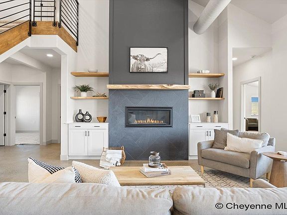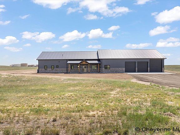 Welcome to your Wyoming barndominium! Enjoy all the luxuries of a modern 4 bedroom, 4 bath home, paired with an attached 40x60 shop. Plenty of space out of the elements for vehicles, toys, or equipment, plus additional entertaining or workshop space. Wide open floor plan with soaring ceilings and tons of natural light. 22ft fireplace with hand-crafted live-edge wood mantle and matching live-edge floating shelves. Expansive kitchen featuring natural wood cabinets, quartz countertops, center island with breakfast bar, a custom hood, open shelving, and black stainless appliances. A sprawling primary suite with a 5-piece bath and enormous walk-in closet with 2nd laundry hookups and a hidden room. Enjoy the stunning Wyoming sunsets on the covered front porch, or entertain on your extra large covered back patio, perfectly setup to add an outdoor kitchen. Work-from-home made easy with the office situated right off the front door with a large picture window. Appreciate primarily one-level living with an additional ensuite bedroom or flex space in the loft. Stained concrete floors, sliding barn doors, exposed spiral ductwork, solid red iron steel framing and no-maintenance steel siding. Make this dream home yours today!