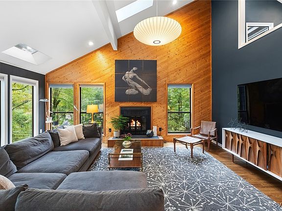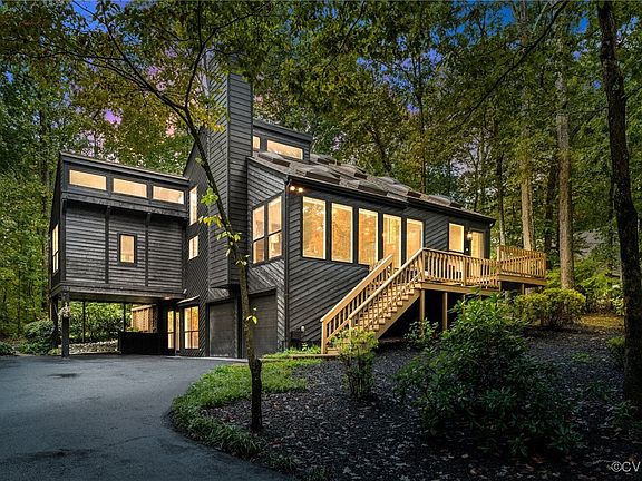 Modern dream home in Bon Air, nestled in a private, wooded oasis just 7 minutes from Carytown and 11 minutes from downtown and Scott’s Addition. The open, airy interior features 20-foot vaulted ceilings, floor-to-ceiling windows, and 18 skylights. The expansive floor plan, perfect for entertaining and everyday living, centers around a renovated gourmet kitchen with stainless steel GE Cafe appliances, including an induction range with a double oven, convection microwave, smart range hood, and a KitchenAid dishwasher. The kitchen also boasts a custom porcelain tile backsplash, granite countertops, exposed wood beams, and an oversized farmhouse sink. A huge custom pantry, open oak shelves, 40” upper cabinets, and a 10x6 island with ample storage complete the space. Hardwood floors and updated lighting, including LED recessed lights, enhance the home’s warmth and brightness.